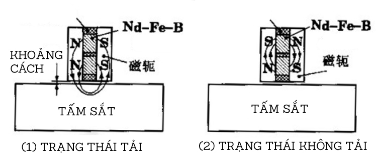 - Ở trạng thái OFF: Nam châm vĩnh cửu bị che chắn, từ trường không tác động ra ngoài, thiết bị không hút thép.